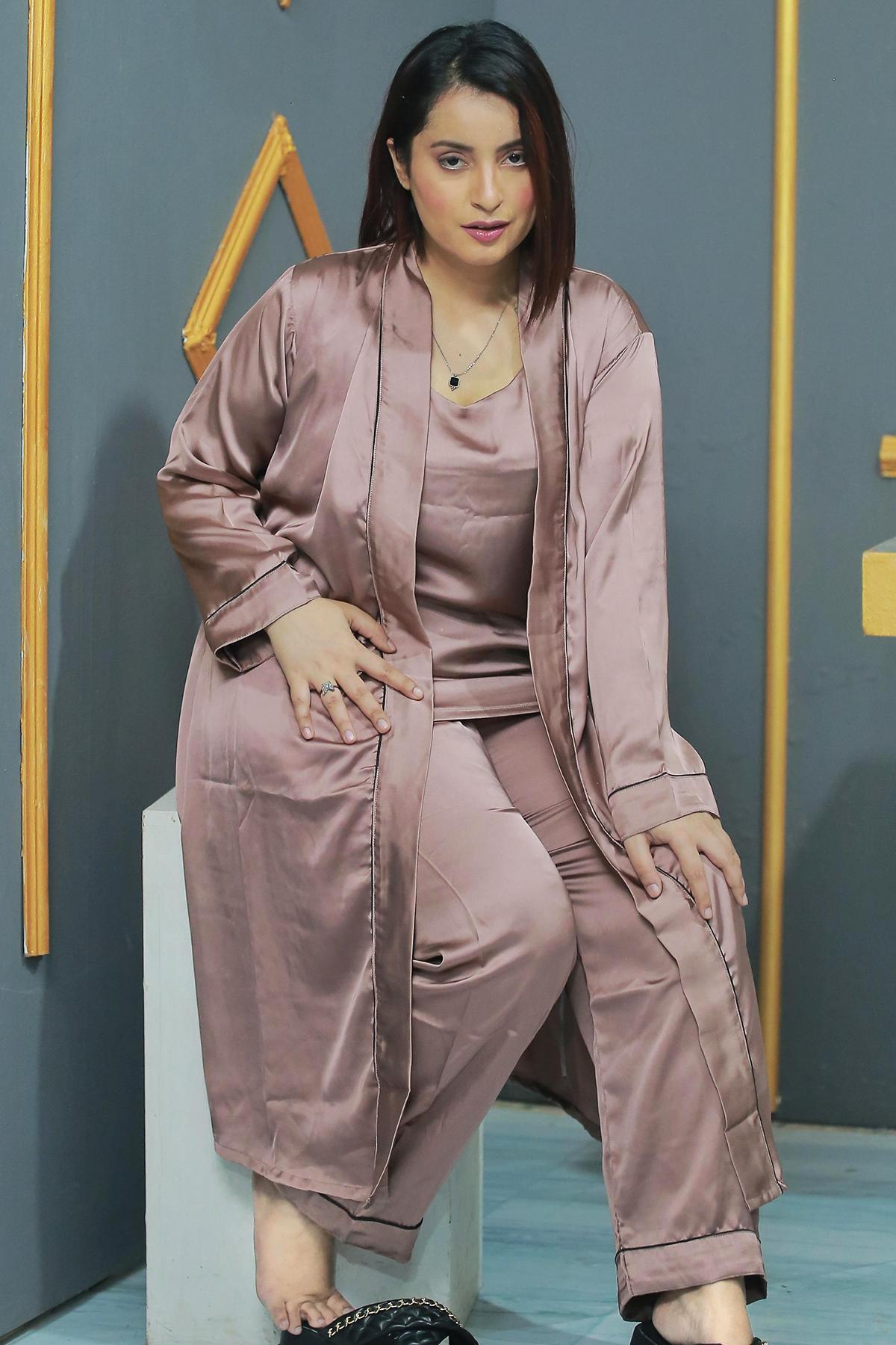 *For Express Delivery Order before 7 pmExperience the epitome of elegance and comfort with Quirky Wear’s 3-Piece Gown Set. Perfect for lounging in style or enjoying a restful night, this set includes a luxurious gown, a comfortable camisole, and a chic trouser, making it a versatile addition to your sleepwear collection.